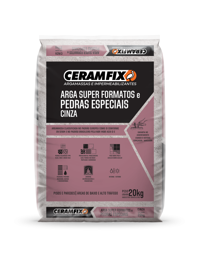 A Arga Super Formatos e Pedras Especiais Ceramfix se destaca como uma argamassa colante monocomponente, oferecendo alto poder de aderência e notável flexibilidade. Especialmente desenvolvida para a instalação de revestimentos de grandes formatos e rochas especiais, esta argamassa é indicada para uso em áreas internas, externas, fachadas e locais de tráfego intenso. Classificada como argamassa colante tipo AC III D E conforme a norma brasileira ABNT NBR 14081-1, e com a classificação C2ES1 de acordo com a norma europeia ISO 13007-1, este produto atende a padrões rigorosos de qualidade. Sua formulação avançada a torna uma escolha confiável para projetos que exigem resistência, flexibilidade e desempenho excepcionais, proporcionando uma solução duradoura e eficaz.