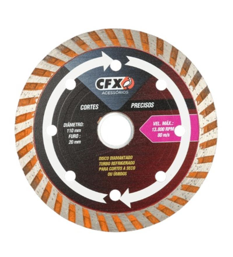 Disco diamantado com segmentos turbo, projetado para cortes rápidos e eficientes em revestimentos cerâmicos e materiais de alvenaria. Ideal para uso com refrigeração a ar, combina alta velocidade de corte com maior durabilidade, mantendo baixa geração de calor e melhor acabamento nas bordas.