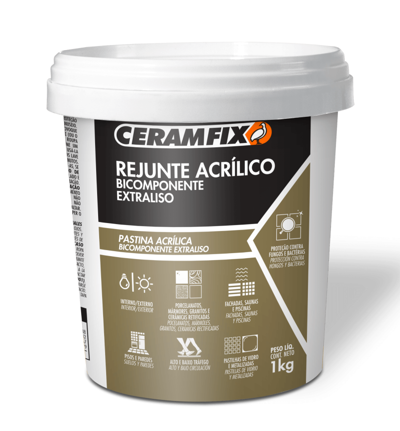 O Rejunte Acrílico Bicomponente Extraliso Ceramfix é uma argamassa de rejuntamento especial, composta por resinas acrílicas, aglomerantes e cargas minerais. Desenvolvido para aplicação em juntas de 0,5 a 5 mm, é de fácil aplicação e proporciona um acabamento extraliso. Indicado para porcelanatos, mármores, granitos e cerâmicas retificadas, este produto destaca-se pela excelente aderência, resistência mecânica, flexibilidade, baixa absorção e proteção contra fungos e bactérias, devido à sua alta aditivação. Livre de areia em sua composição, oferece um acabamento extraliso, com cores uniformes e permanentes.